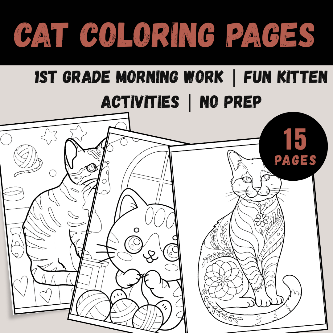 Bring some feline fun into your classroom with this collection of 15 unique Cat Coloring Pages! Designed specifically with 1st-grade students in mind, these sheets are perfect for fast finishers, morning work, indoor recess, or as a creative supplement to a "pets" themed unit.