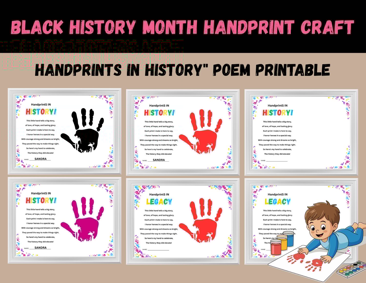 - Page 1: "Handprints in History" template with a poem about honoring heroes and their bright dreams.