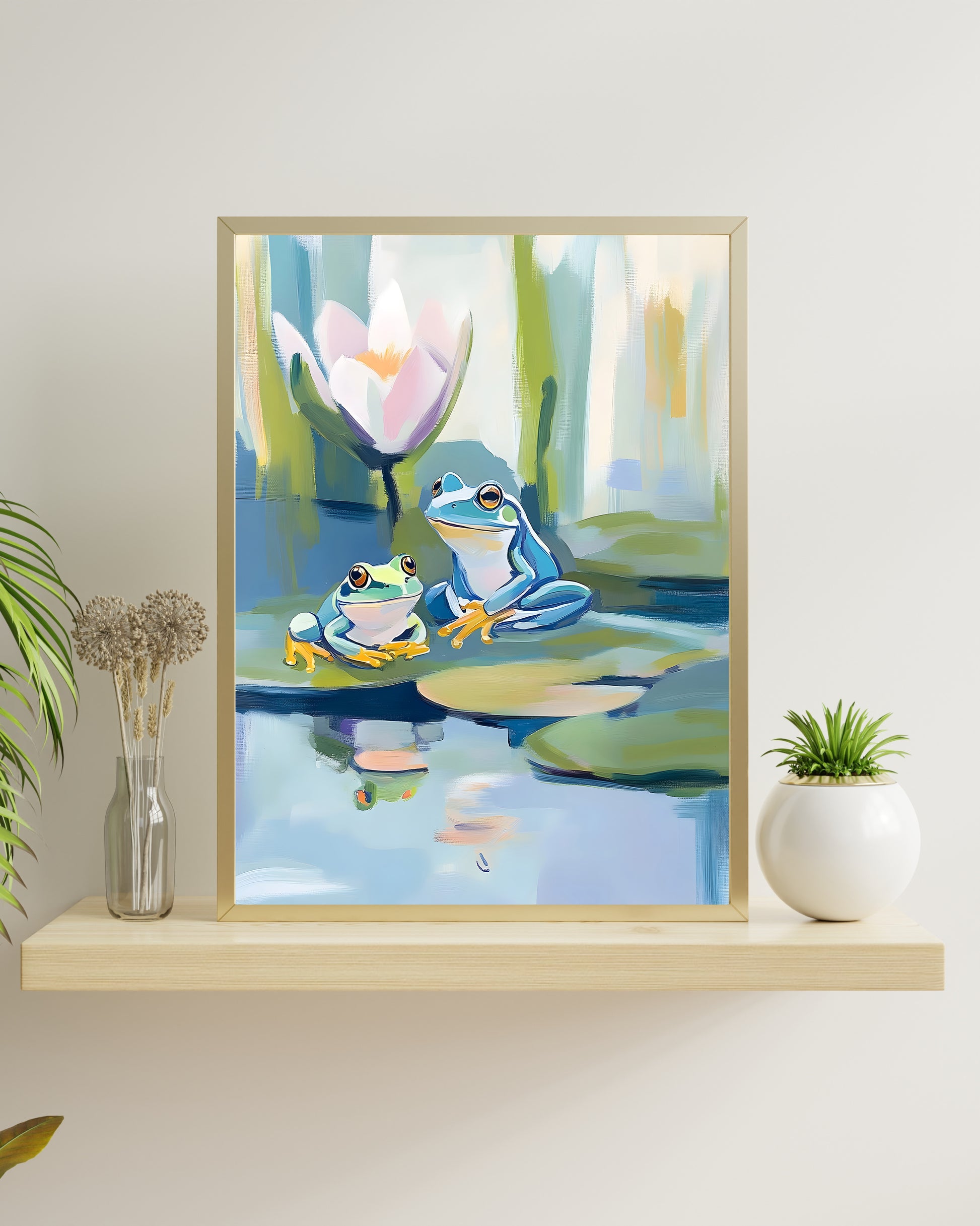 Two charming frogs on a lily pad in a tranquil pond. Whimsical, painterly art for a nursery or any peaceful space. Instant digital download.